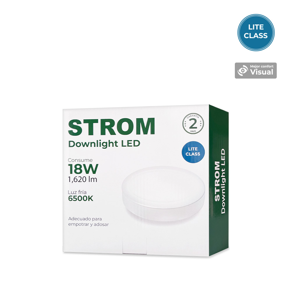 Descubre los DownLight LED STROM, luminarias empotrables de techo para uso interior. Con una eficacia luminosa superior a 90 lm/W y una distribución de luz homogénea, son la opción ideal para instalaciones fáciles y rápidas. No necesita driver externo. La temperatura de color de 6,500 K (luz blanca fría) es perfecta para ambientes de trabajo detallados. Además, disfruta de 2 años de garantía.