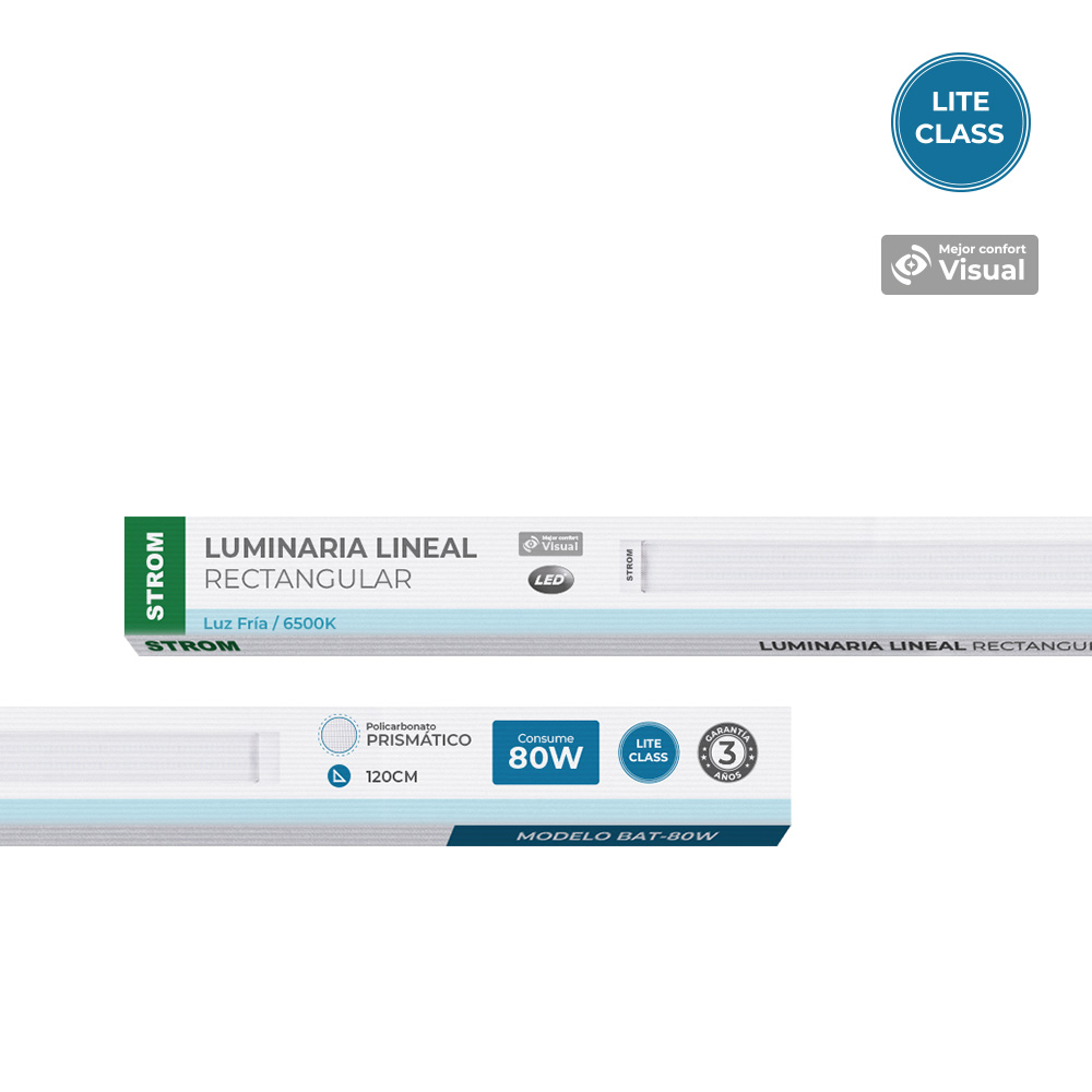La luminaria lineal LED STROM de 80W con cubierta prismático es una solución eficiente y versátil para iluminación general. Ofrece hasta 86% de ahorro energético, 25,000 horas de vida útil y luz blanca de 6500K con distribución uniforme que mejora la visibilidad y el confort visual.