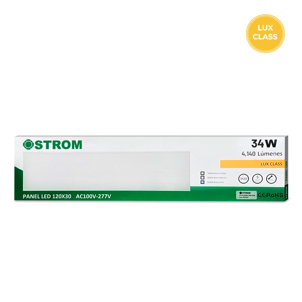 El Panel LED STROM STPL1203034W65K es una solución eficiente y confiable para iluminación interior, con una potencia de 34W y un flujo luminoso superior a 3400 lúmenes. Ofrece luz blanco fría de 6500K. Fabricado en aluminio extruido, ideal para oficinas, comercios y espacios corporativos.
